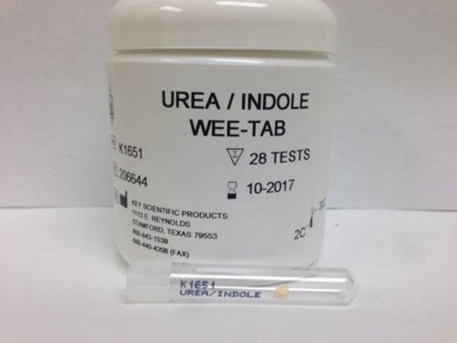 Traditional urease and indole tests require long incubation and require special handling for anaerobes. The Urea/Indole Wee-Tab gives results for both Urease and Indole production, incubates aerobically for 2-4 hours, and has 28 ready to use tubes per package. The tablets are stored at room temperature with a long shelf life. KEY Urea/Indole tests may be used for enterics and other types of bacteria, including anaerobes and Campylobacter species.