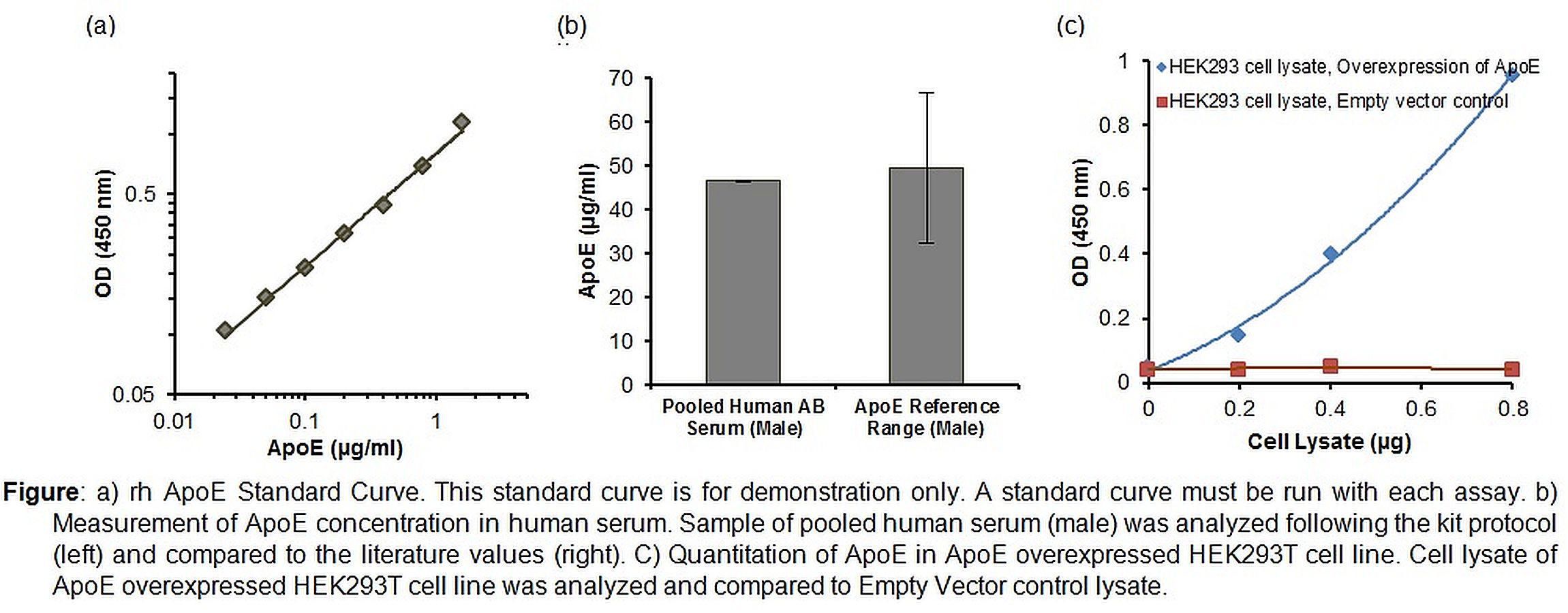 Apolipoprotein E (human) ELISA Kit 100 assays^ Apolipoprotein E (human) ELISA Kit, Sensitive, Colorimetric Assay, Detection Method Absorbance (450 nm), Species: human, Applications Quantitative measurement. Sensitivity: 25 ng/ml. Detection range: 25 ng to 1. 6 ug/ml, Size: 100 assays