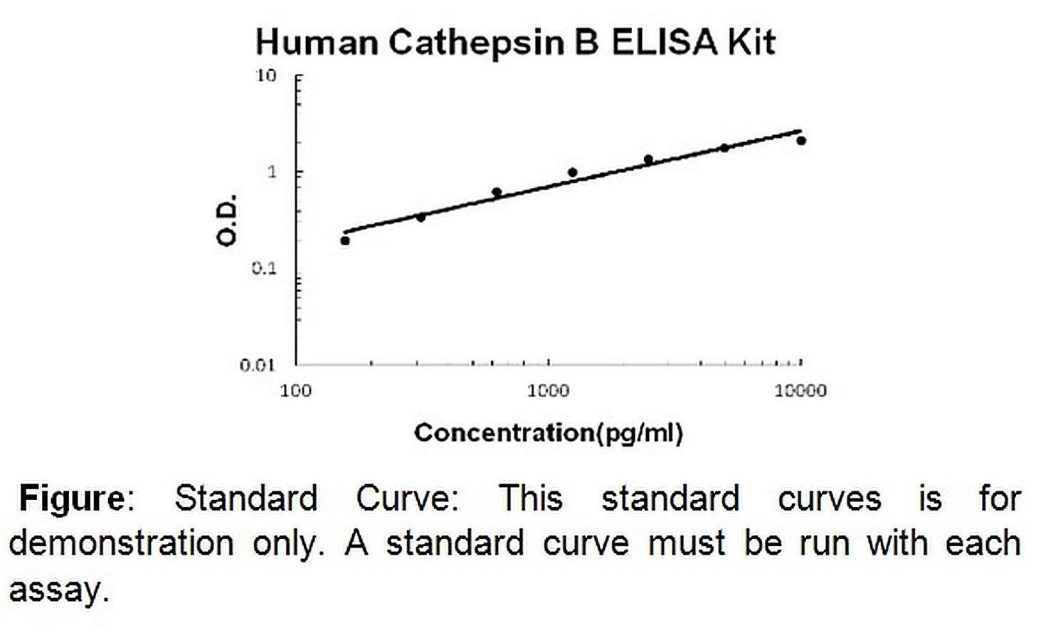 Cathepsin B (human) ELISA Kit 100 assays^ Cathepsin B (human) ELISA Kit, Sensitive, Colorimetric Assay, Detection Method Absorbance (450 nm), Species: human, Applications Quantitative protein detection. Detection Range: 156-10, 000 pg/ml. Sensitivity: < 5 pg/ml, Size: 100 assay