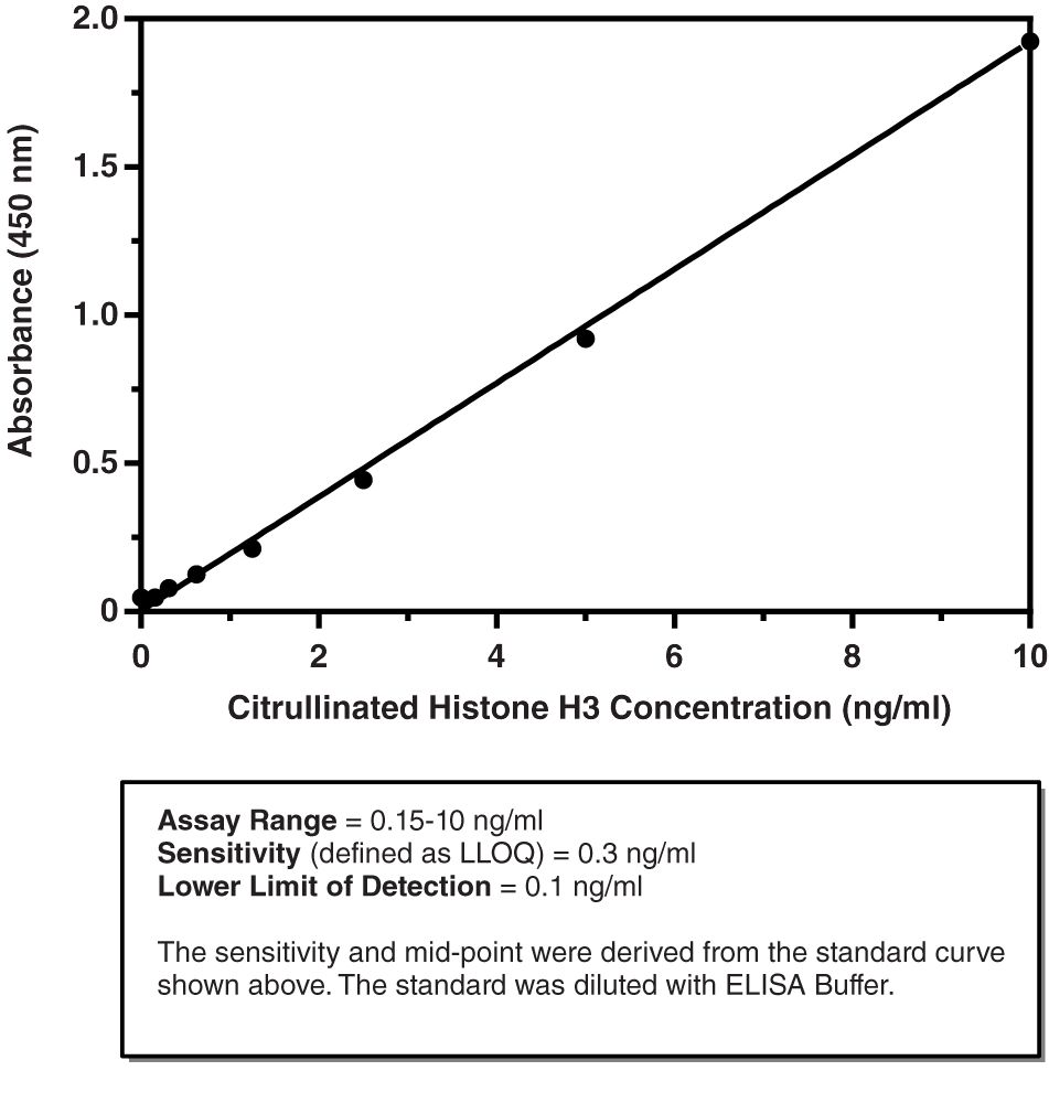 Citrullinated Histone H3 (Clone 11D3) Elisa Kit 0.15-10 Ng/Ml^ Citrullinated Histone H3 (Clone 11D3) Elisa Kit, Contains: Conjugate, Strip Plate, Standard, Buffers, Polysorbate 20, Solutions, And Cover Sheet, Range: 0.15-10 Ng/Ml, Sensitivity: 0.3 Ng/Ml, Rapid Assay, Get Results In Under 4 Hour