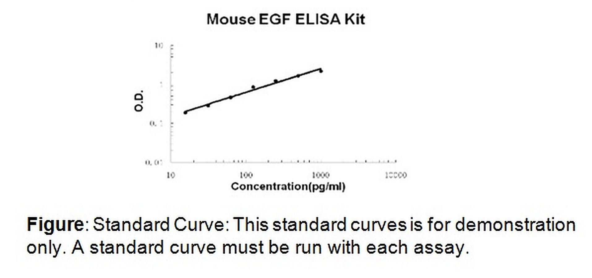 EGF (mouse) ELISA Kit 100 assays^ EGF (mouse) ELISA Kit, Sensitive, Colorimetric Assay, Detection Method Absorbance (450 nm), Species: mouse, Applications Quantitative protein detection, establishing normal range etc. Detection Range: 15. 6-1000 pg/ml. Sensitivity: < 1 pg/ml, Size: 100 assay