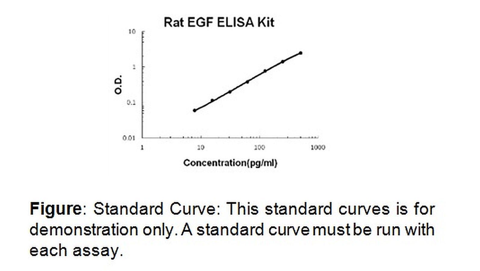 EGF (rat) ELISA Kit 100 assays^ EGF (rat) ELISA Kit, Sensitive, Colorimetric Assay, Detection Method Absorbance (450 nm), Species: rat, Applications Quantitative protein detection, establishing normal range etc. Detection Range: 7. 8-500 pg/ml. Sensitivity: < 1 pg/ml, Size: 100 assay