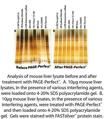 Page clean up kit 5 preps^ Page-Perfect* For publication quality gels. Processes 5 samples of 1-100ul before loading onto gel to give highest quality gels, also works with difficult samples or dilute solutions. Removes excess conc. of salts, acids, bases and other agents giving clean and conc smpl