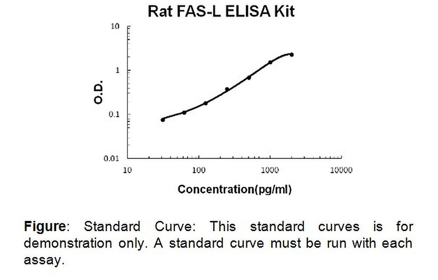 FasL (rat) ELISA Kit 100 assays^ FasL (rat) ELISA Kit, Sensitive, Colorimetric Assay, Detection Method Absorbance (450 nm), Species: Rat, Applications Quantitative protein detection, establishing normal range etc. Detection Range: 31. 2-2000 pg/ml. Sensitivity: < 10 pg/ml, Size: 100 assay