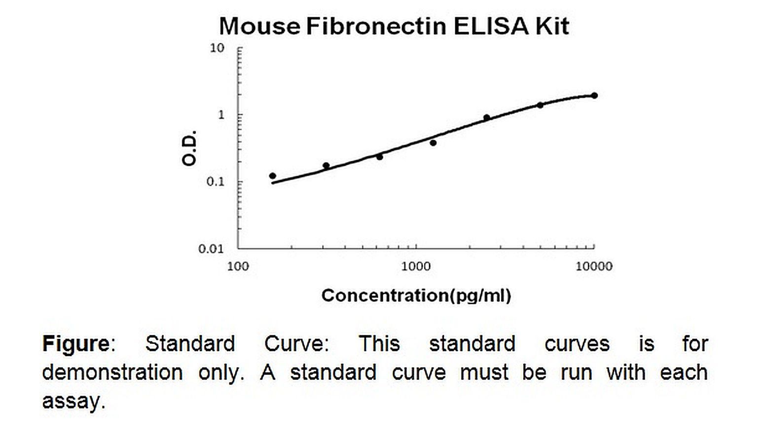 Fibronectin (mouse) ELISA Kit 100 assays^ Fibronectin (mouse) ELISA Kit, Sensitive, Colorimetric Assay, Detection Method Absorbance (450 nm), Species: Mouse, Applications Quantitative protein detection. Detection Range: 156 pg/ml - 10, 000 pg/ml. Sensitivity: < 15 pg/ml, Size: 100 assay