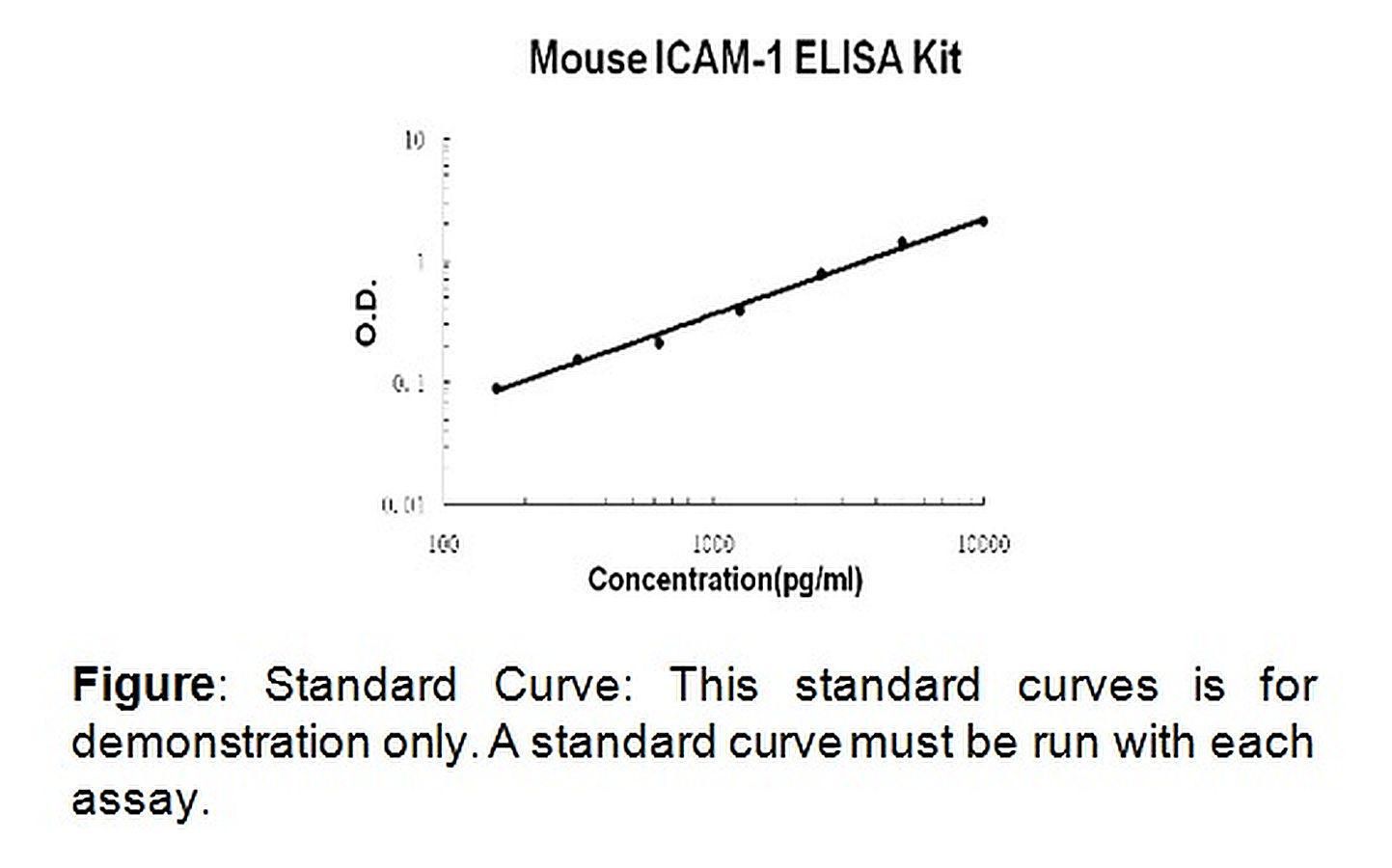 ICAM-1 (mouse) ELISA Kit 100 assays^ ICAM-1 (mouse) ELISA Kit, Sensitive, Colorimetric Assay, Detection Method Absorbance (450 nm), Species: mouse, Applications Quantitative protein detection. Detection Range: 156 pg/ml - 10, 000 pg/ml. Sensitivity: < 10 pg/ml, Size: 100 assay