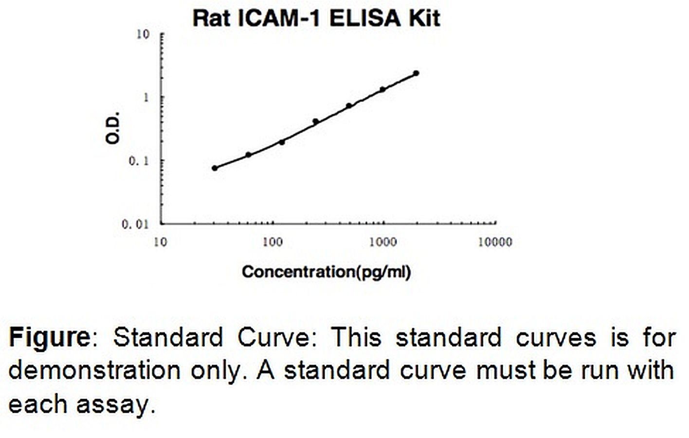 ICAM-1 (rat) ELISA Kit 100 assays^ ICAM-1 (rat) ELISA Kit, Sensitive, Colorimetric Assay, Detection Method Absorbance (450 nm), Species: mouse, Applications Quantitative protein detection. Detection Range: 156 pg/ml - 10, 000 pg/ml. Sensitivity: < 10 pg/ml, Size: 100 assay