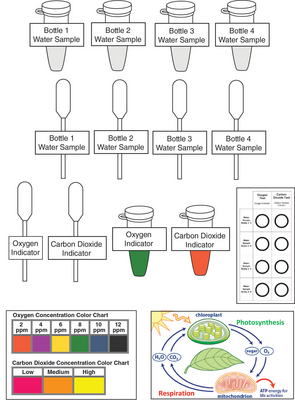 Plants in a bottle kit^ Plants in a bottle kit, photosynthesis and respiration, Kit contains: Student instructions, CO2 Indicator, O2 and CO2 Concentration Color Charts, 4 simulated water samples, 6 labeled droppers, Photosynthesis and Respiration Diagram Sheet, O2 Indicator, O2 and CO2 Test Sheet