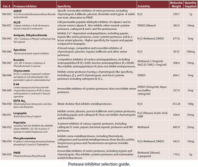 Protease Inhibitor Set^ Contains eleven ready to use individual protease inhibitors for characterization of protease activity. Set contains Antipain-dihydrochloride, Aptotinin, Bestatin, Chymostatin, E-64, EDTA-Na2, Leupeptin, Pepstatin, Phosphoramidon, AEBSF, and PMSF in 100x concentration.
