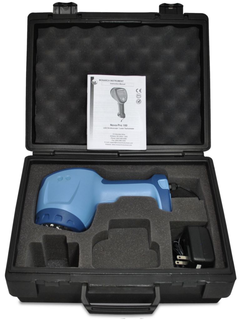 Nova-Pro 100 AC Kit^ Nova-Pro 100 AC LED Stroboscope Kit, Includes: 115/230 Vac wall adapter power supply. Includes USA, UK, AUS, Euro adapter plugs and operation manual and plastic latching carry case, Display: 6 Digit Numeric /5 Digit Alphanumeric LCD, Tachometer Mode: 0-999,999 RPM