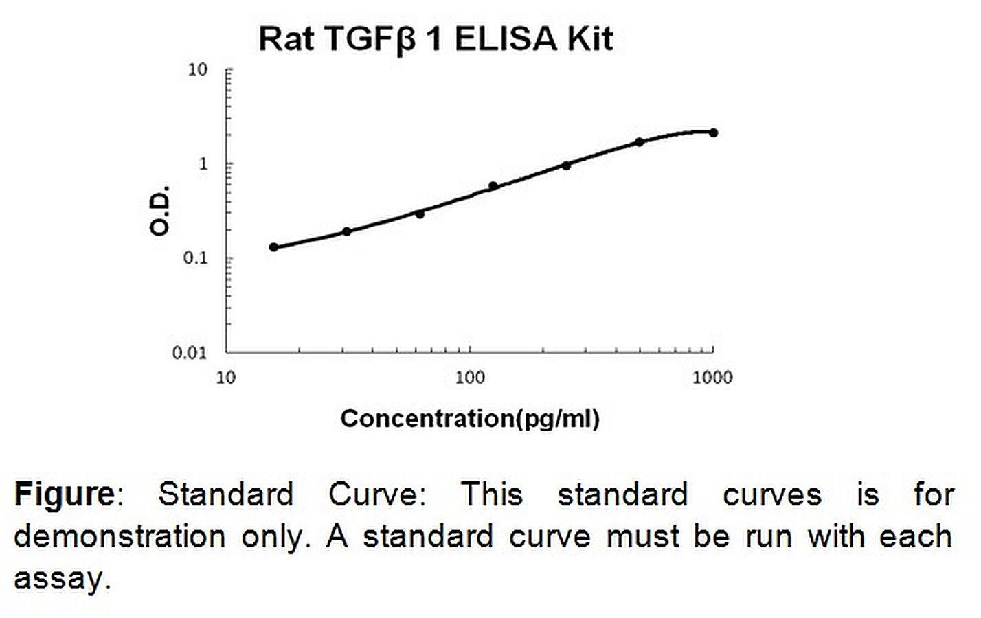 TGF-beta1 (rat) ELISA Kit 100 assays^ TGF-beta1 (rat) ELISA Kit, Sensitive, Colorimetric Assay, Detection Method Absorbance (450 nm), Species: rat, Applications Quantitative protein detection, establishing normal range. Detection Range: 15. 6-1000 pg/ml. Sensitivity: < 1 pg/ml, Size: 100 assay