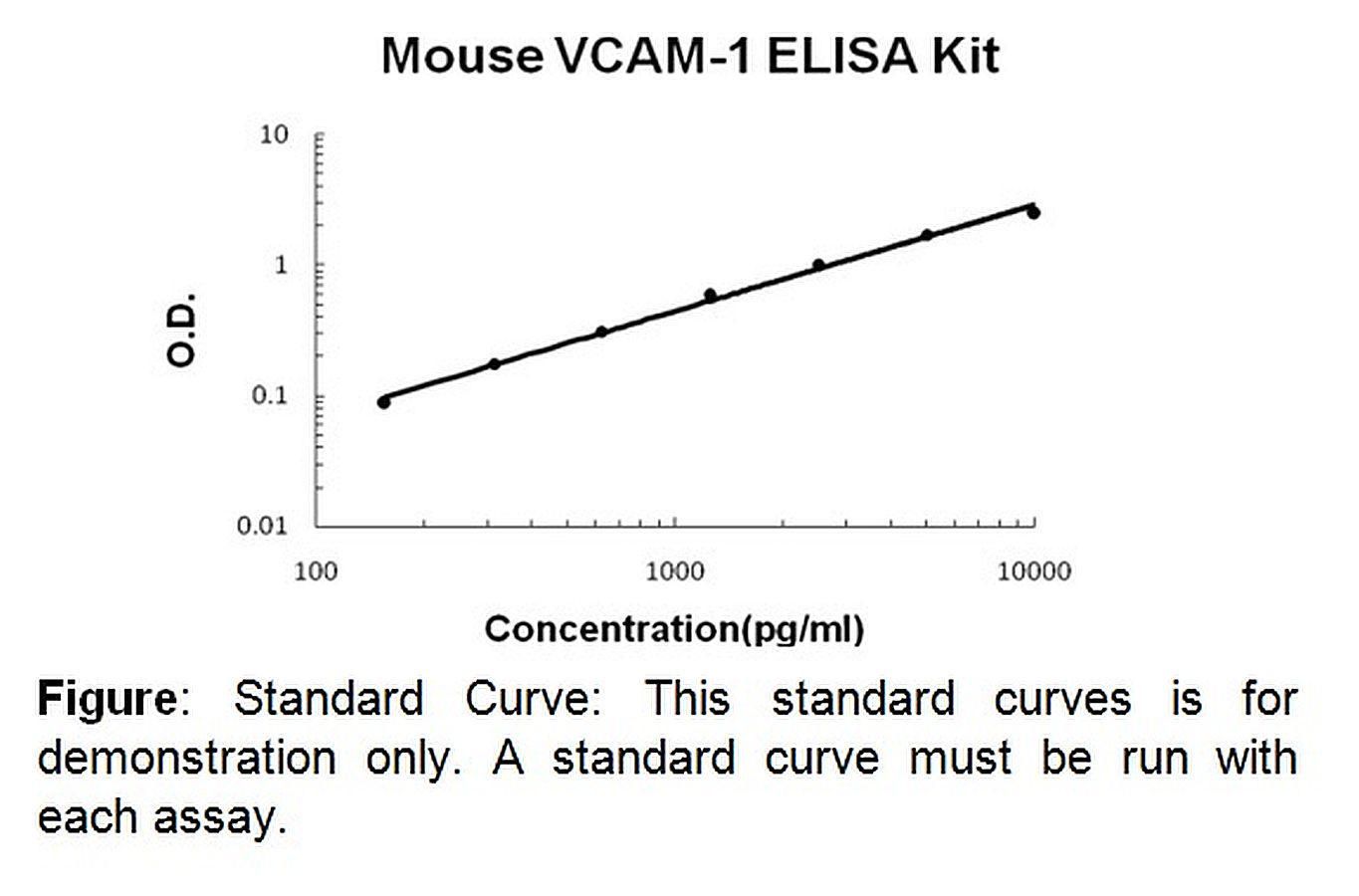 VCAM-1 (mouse) ELISA Kit 100 assays^ VCAM-1 (mouse) ELISA Kit, Sensitive, Colorimetric Assay, Detection Method Absorbance (450 nm), Species: human, Applications Quantitative protein detection, Detection Range: 156 pg/ml - 10, 000 pg/ml. Sensitivity: < 10 pg/ml, Size: 100 assay