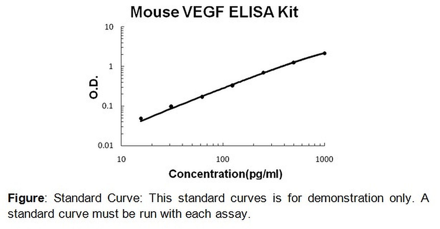 VEGF (mouse) ELISA Kit 100 assays^ VEGF (mouse) ELISA Kit, Sensitive, Colorimetric Assay, Detection Method Absorbance (450 nm), Species: mouse, Applications Quantitative protein detection, establishing normal range. Detection Range: 15. 6 pg/ml - 1000 pg/ml, Size: 100 assays