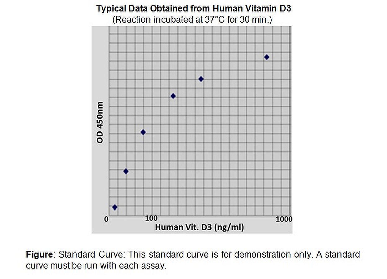 Vitamin D3 (human) ELISA Kit 100 assays^ Vitamin D3 (human) ELISA Kit, Sensitive, Colorimetric Assay, Detection Method Absorbance (450 nm), Species: human, Applications Quantitative protein detection. Detection Range: 200 - 800 ug/L, Size: 100 assays