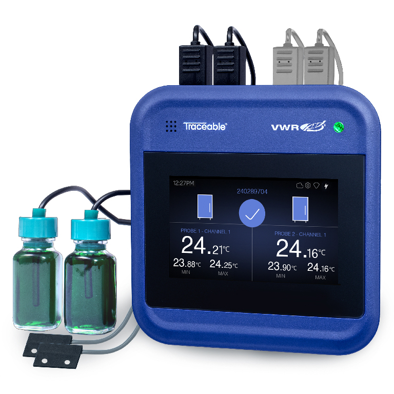 Stay connected to your critical environment measurements no matter where you are — get email, text, and push notifications to your internet-connected device., Start recording measurements quickly with these pre-made kits. They offer exciting features such as an intuitive touchscreen interface, enhanced PIN-based security, simple calibration with smart probes, door sensors to prevent accidental temperature excursions, faster setup, longer-lasting battery backup during power outages, support for 5 or 2.4 GHz Wi-Fi connections, and a cradle for mounting in place. smart probes include temperature bullet probes, bottle probes, or vaccine bottle probes to meet a variety of applications., 04_BodyText: Once setup is complete a user can securely monitor parameters 24/7, control alarms remotely, view data logging history, run reports in real time, and give access to other team members. No local software is required to use the cloud-based data interface. Get mobile push notifications, emails, or texts for out-of-range conditions, connectivity interruptions, low-battery condition, or calibration notice., 05_BodyText: The logger can be mounted with the included hook-and-loop adhesive strip or placed on a countertop with the optional cradle. The cable on the smart probes allows a door gasket to close on them for use in refrigerators or freezers., 06_BodyText: Traceable® Products have an individually numbered Traceable® Certificate provided with each unit, that assures accuracy from our ISO/IEC 17025:2017 (1750.01) calibration laboratory accredited by A2LA. It indicates traceability of measurements to the SI units through NIST or other recognized national measurement institutes (NMI) that are signatories to the CIPM Mutual Recognition Agreement. Each product goes through an intense vetting process before it can carry the Traceable name, thus saving you both time and money by not having to calibrate separately., 07_BodyText: No. of channels: 4 | System requirements: 5 or 2.4 GHz Wi-Fi connection | Operating temperature: 0...50 °C (32...122 °F), 02_BulletPoint: Kits come with a temperature smart probe and a door sensor and can support up to two of each | Smart Probes measure laboratory conditions such as temperature, and have built-in NIST calibration for quick set-up and easy replacement | Intuitive touchscreen display | Simple, one-time setup only takes a few minutes | Enhance security with on-board measures including optional PIN protection to prevent tampering | Works with TraceableLIVE® cloud service for alerts, reporting, and configuration | Includes NIST-traceable certificate of calibration from our A2LA-accredited ISO/IEC 17025:2017 (1750.01) laboratory, 08_Certifications: NIST-traceable certificate of calibration from our A2LA-accredited ISO/IEC 17025:2017 (1750.01) laboratory., 11_Delivery: One data logger, one Smart Probe™, one door sensor, mountable cradle, hook-and-loop adhesive strip, power supply, and NIST-traceable calibration certificate with data., 10_Ordering: A TraceableLIVE® subscription is required for use., Resolution: 0.01°, Stay connected to your critical environment measurements no matter where you are — get email, text, and push notifications to your internet-connected device., Start recording measurements quickly with these pre-made kits. They offer exciting features such as an intuitive touchscreen interface, enhanced PIN-based security, simple calibration with smart probes, door sensors to prevent accidental temperature excursions, faster setup, longer-lasting battery backup during power outages, support for 5 or 2.4 GHz Wi-Fi connections, and a cradle for mounting in place. smart probes include temperature bullet probes, bottle probes, or vaccine bottle probes to meet a variety of applications., 04_BodyText: Once setup is complete a user can securely monitor parameters 24/7, control alarms remotely, view data logging history, run reports in real time, and give access to other team members. No local software is required to use the cloud-based data interface. Get mobile push notifications, emails, or texts for out-of-range conditions, connectivity interruptions, low-battery condition, or calibration notice., 05_BodyText: The logger can be mounted with the included hook-and-loop adhesive strip or placed on a countertop with the optional cradle. The cable on the smart probes allows a door gasket to close on them for use in refrigerators or freezers., 06_BodyText: Traceable® Products have an individually numbered Traceable® Certificate provided with each unit, that assures accuracy from our ISO/IEC 17025:2017 (1750.01) calibration laboratory accredited by A2LA. It indicates traceability of measurements to the SI units through NIST or other recognized national measurement institutes (NMI) that are signatories to the CIPM Mutual Recognition Agreement. Each product goes through an intense vetting process before it can carry the Traceable name, thus saving you both time and money by not having to calibrate separately., 07_BodyText: No. of channels: 4 | System requirements: 5 or 2.4 GHz Wi-Fi connection | Operating temperature: 0...50 °C (32...122 °F), 02_BulletPoint: Kits come with a temperature smart probe and a door sensor and can support up to two of each | Smart Probes measure laboratory conditions such as temperature, and have built-in NIST calibration for quick set-up and easy replacement | Intuitive touchscreen display | Simple, one-time setup only takes a few minutes | Enhance security with on-board measures including optional PIN protection to prevent tampering | Works with TraceableLIVE® cloud service for alerts, reporting, and configuration | Includes NIST-traceable certificate of calibration from our A2LA-accredited ISO/IEC 17025:2017 (1750.01) laboratory, 08_Certifications: NIST-traceable certificate of calibration from our A2LA-accredited ISO/IEC 17025:2017 (1750.01) laboratory., 11_Delivery: One data logger, one Smart Probe™, one door sensor, mount
