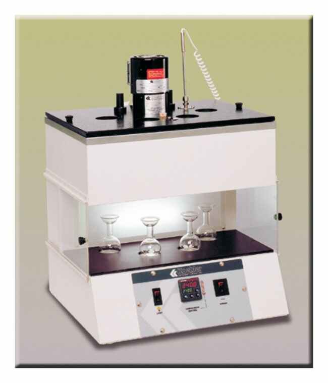 Constant temperature bath with available automatic timing feature for viscosity determinations using Saybolt viscometer tubes and orifices. Saybolt Universal Seconds (SUS) is the standard measurement for lubricants, insulating oils and lighter fuel grades, and Saybolt Furol Seconds (SFS) is used for heavier oils and bitumens.Microprocessor PID circuitry assures precise temperature control within ASTM specified tolerances throughout operating range of bath Simple push-button controls and dual digital displays permit easy setting and monitoring of bath temperatureTwo-place calibration offset is providedAccommodates four viscometers and four 60mL receiving flasksSliding draft shields and a chemical-resistant alignment plate facilitate handling of the flasksGlare-free fluorescent backlighting enables easy viewing of samplesRecommended bath medium: water or suitable heat transfer fluid (sold separately) Specifications: Temperature Range: ambient to 464°F (240°C)Temperature Stability: ±0.05°F (±0.03°C)Bath Capacity: 5 gal. (19L)Electrical Reqts: 115V 50/60Hz, single phase, 12.3ADimensions: 29L x 25W x 33 in.H (74 x 63.5 x 84cm)Net Weight: 65 lb. (29.5kg)Shipping Weight: 82 lb. (37kg)Shipping Dimensions: 10 cu. ft.ComplianceMeets specifications of: ASTM D88, D244, E102; AASHTO T72; FTM 791-304.