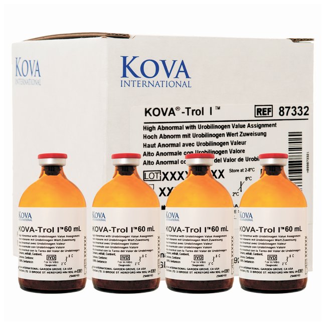 Human urine-based in freeze dried vials at high abnormal with urobilinogen valuesKOVA controls helps to validate the performance of urine chemistry test strips and readers and helps to focus on microscopic sediment analysis. Choose the KOVA controls that best meet the needs of your lab. For maximum quality control information for Urinalysis testing, choose the KOVA-Trol line of lyophilized controls.External quality control of physical, chemical and microscopic examination of urine specimensAvailable with or without microscopicsThree levels of controls to monitor complete decision range for urine strip chemistriesValue assignments available on all major systems for visual and instrument analysisStability: 27 month shelf life at 2° to 8°C and 7 days after reconstitutionStorage:Lyophilized KOVA-Trol product is stable until the expiration date stated on the label when stored between 2° to 8°C. Following reconstitution, keep the liquid KOVA-Trol stoppered and refrigerated. When KOVA-Trol is properly reconstituted and stored at 2° to 8°C, the constituents are stable from the date of reconstitution for a maximum of seven days. The useful life may be extended up to one month by storing reconstituted KOVA-Trol in single-use 7mL aliquots frozen at -20° to -40°C.Recommended StorageLyophilized KOVA-Trol product is stable until the expiration date stated on the label when stored between 2° to 8°C. Following reconstitution, keep the liquid KOVA-Trol stoppered and refrigerated.