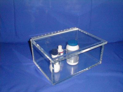 Lab Beta Storage Container^ made out of 3/8in clear acrylic. Flame treated edges for smoothness. Rubber pads on bottom to prevent slipping. Dimensions: 11in w x 5in h x 8in d.