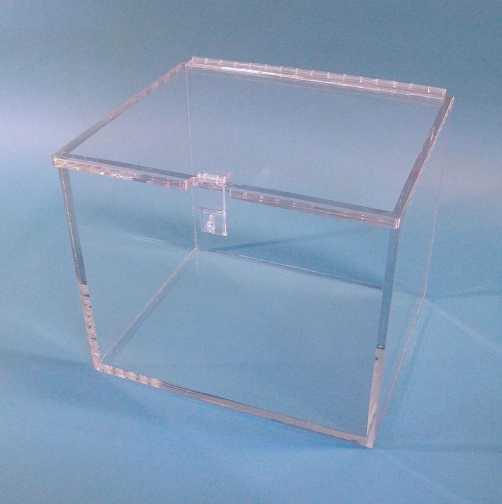 Lab Beta Storage Container^ made out of 3/8in clear acrylic. Flame treated edges for smoothness. Rubber pads on bottom to prevent slipping. Dimensions: 12in w x 10in h x 10in d.