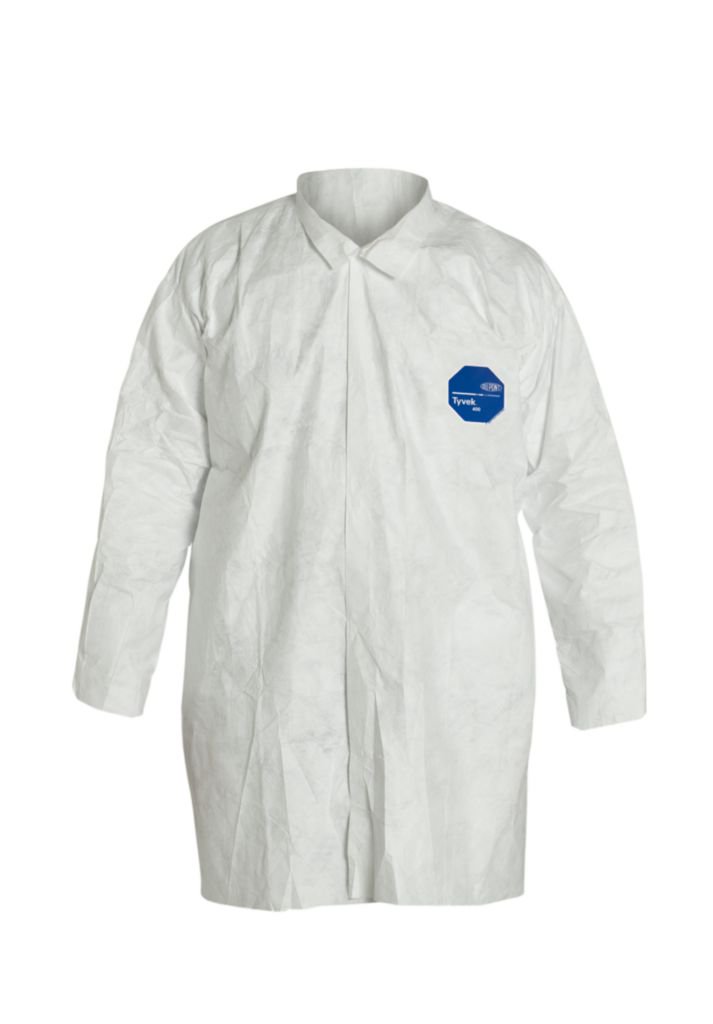 DuPont* Tyvek* Lab Coat^ Made from tear-resistant, lightweight, spunbonded olefin. Offers splash, dry-particulate, and bacteria protection. Disposable, low-linting lab coat features serged seams, collar, and front snap closure. No pockets. Bulk packed. White. Size: Large.
