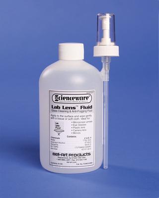LABLENS STATION LIQUID^ Lens cleaning solution in a 473ml (1 pint) polyethylene bottle. Spray pump for bottle is included in each case of 12 bottles.