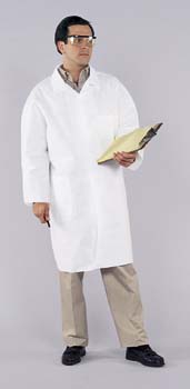 KLEENGUARD* XP Lab Coat^ Provides excellent particle barrier. Resists nonhazardous liquids. Lamination of microporous film and spunbond nonwoven material. Dry particle holdout of 100% between 0.3-0.5um. Features a collar, elastic wrists, and two pockets. Meets ANSI/ISEA 101-101-1996. White. Medium.