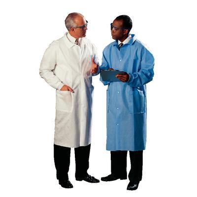 Kimberly Clark* Lab Coat^ Universal precautions lab coat, 3-layer fabric, white, small. Traditional collar and knit cuffs. 6 snaps. 3 reinforced pockets. Back vent. Neck loop for hanging. Tailored styling and fit enhances worker comfort. Exceptional resis