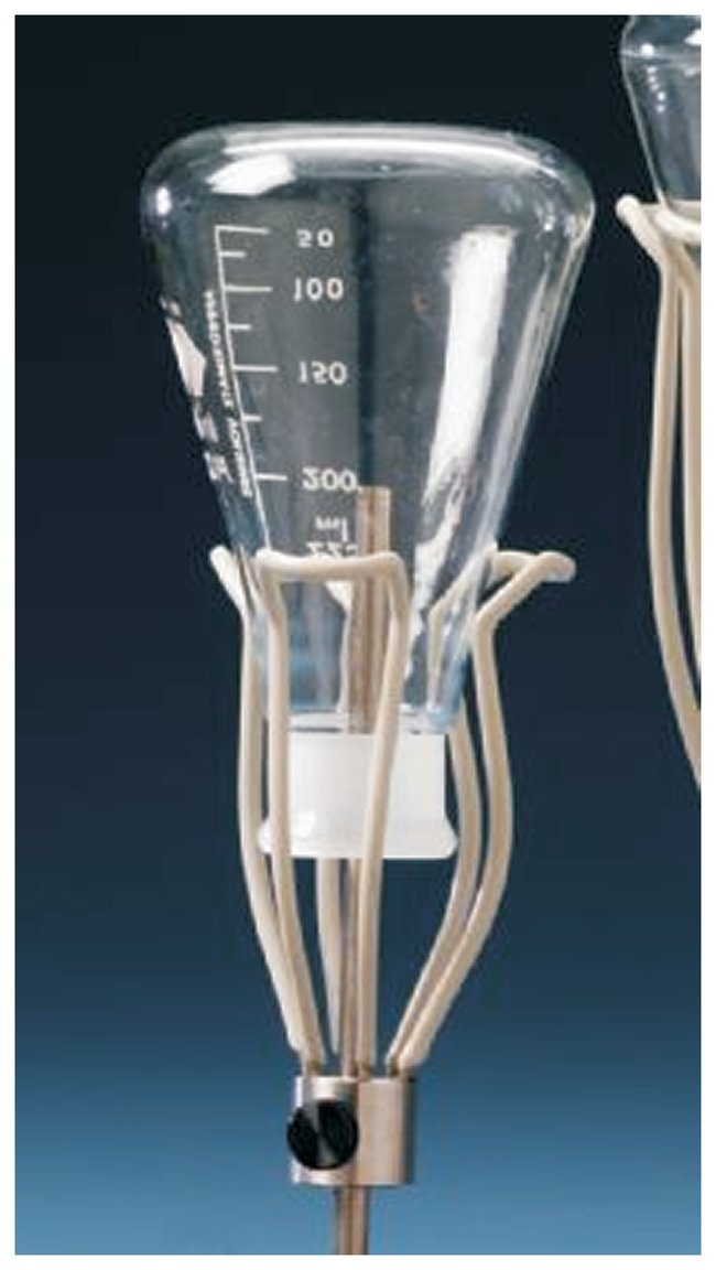 Glassware Holders are made of vinyl-coated Type 304 stainless steel with height adjustment screw and fit onto spindles to grip glassware and hold it in place. For use on upper or lower racks of FlaskScrubber Glassware Washers.