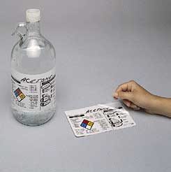 Hazardous Warning Labels^ Hand write the chemical name, fill in the warning diamond and circle the appropriate personal protection symbols. A self-laminating flap then seals the writing and protects the label from solvents, acids, etc. 51x89mm label.