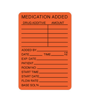 Medication added labels are offered in bright, fluorescent colors and are imprinted in bold with 'Medication Added' at the top, front and center., Additional lines available to fill out on medication added labels include: patient, room number, drug, amount, rate, added by, date, time, and expiration date., 02_BulletPoint: Bright coloring | Bold lettering for 'Medication Added' | Additional label lines, Medication added labels are offered in bright, fluorescent colors and are imprinted in bold with 'Medication Added' at the top, front and center., Additional lines available to fill out on medication added labels include: patient, room number, drug, amount, rate, added by, date, time, and expiration date., 02_BulletPoint: Bright coloring | Bold lettering for 'Medication Added' | Additional label lines, Color: Flourescent Red with Black Imprint, VWR® medication added labels, Dimensions: 50.8×76.2 mm (2×3"), Cat. No.: 89097-840, Packaging: 500 labels/roll