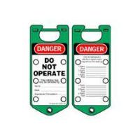 Danger Do Not Operate Lockout Hasp^ Constructed from anodized aluminum alloy with tamperproof locking tabs. Front and back contains write-on surface that accepts pencil, pen or permanent marker. 6 lock holes with 5/16 diameter. 7 1/14H x 3W x 3/16D. Green. 5 per pack.