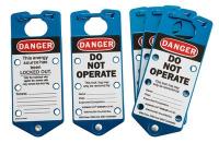 Danger Do Not Operate Lockout Hasp^ Constructed from anodized aluminum alloy with tamperproof locking tabs. Front and back contains write-on surface that accepts pencil, pen or permanent marker. 6 lock holes with 5/16 diameter. 7 1/14H x 3W x 3/16D. Blue. 5 per pack.