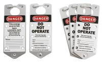 Danger Do Not Operate Lockout Hasp^ Constructed from anodized aluminum alloy with tamperproof locking tabs. Front and back contains write-on surface that accepts pencil, pen or permanent marker. 6 lock holes with 5/16 diameter. 7 1/14H x 3W x 3/16D. Silver. 5 per pack.