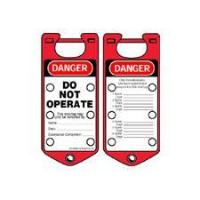 Danger Do Not Operate Lockout Hasp^ Constructed from anodized aluminum alloy with tamperproof locking tabs. Front and back contains write-on surface that accepts pencil, pen or permanent marker. 6 lock holes with 5/16 diameter. 7 1/14H x 3W x 3/16D. Red. 5 per pack.