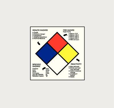 Write-On Hazard Labels^ Paper write-on NFPA hazard labels identify the degree of health hazard, flammability, reactivity and specific hazards of chemicals. Colored squares can be numbered to the NFPA rating system of 0 to 4. White square for specific hazard warning. 102x102mm.