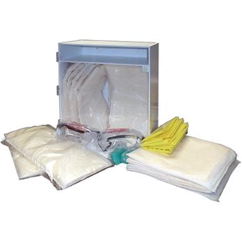 Kit provides a space-saving option for storing sorbent materials in laboratories and cleanrooms. All components are poly-bagged and heat-sealed. Kit dimensions are 18.5” x 15.5” x 9”. Compact kit keeps materials clean and dry until use.Contents include 10 light-duty cleanroom pads (12” x 12”), 10 medium-duty pillows (8.5” x 17”), 2 pair Nitrile gloves, 2 poly aprons, 2 pair splash goggles, 2 disposal bags with twist ties and the plastic cabinet.