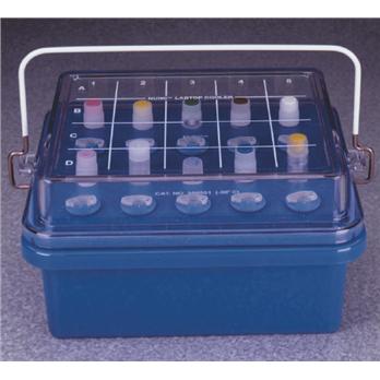StackableLocking handleMaintains freezer temperatureBreak-resistant polycarbonateHolds twenty 1.5 or 2.0 mL microcentrifuge tubes or Cryotube™ vials. Inserts are included to accommodate 0.2 to 0.5 mL tubes. Protects enzymes, cells, reagents and solutions by maintaining freezer temperatures while on the laboratory bench. Also maintains temperature during frost-free cycles, power outages and accidental door openings.