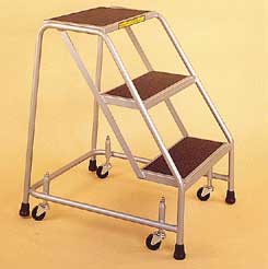 Steel Rolling 3-Step Safety Ladder^ Spring-loaded, rubber swivel casters. Corrosion-resistant finish. Solid steel tread with abrasive mats and deep top step for safety. Steps are 40cm wide. Intermediate steps 18cm deep, top step 25.5cm deep. 72cm high. 136kg capacity. Built to ANSI and OSHA codes.
