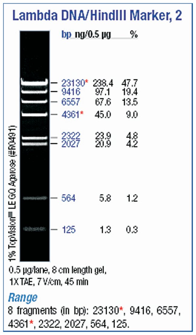 Perform sizing and approximate quantification of large double-stranded DNA fragments in agarose gels with this conventional marker composed of 8 sharp bands.