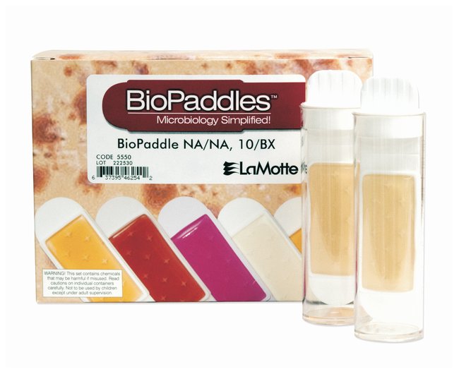 Flexible, ready-to-use paddles identify and quantify microbes in air, soil, water or on any surface.Longer shelf life than traditional Petri dishesNo refrigeration requiredNo need for inoculating loops or Bunsen burnersRequires simple incubation and a magnifierUnique design enhances colony morphology characterizationTen paddles per box Nutrient Agar: For routine culture of non-fastidious bacteria.Sabouraud Dextrose Agar: For selective cultivation of fungi (yeasts and molds).Tryptic Soy (TSA)/Rose Bengal (RB) Agar: For cultivation of a wide variety of microorganisms (TSA) and selective isolation of yeasts and molds (RB).Nutrient TTC/MacConkey: TTC: For field sampling cultivation and enumeration of coliform bacteria total coliform count; Gram (-) bacterial colonies appear as red dots; Gram ( ) bacteria are usually inhibited. MAC: Medium gives improved differentiation between coliforms and nonlactose fermenting organisms; Gram ( ) cocci are usually inhibited.Order InfoShips on Monday and Tuesday ONLY.