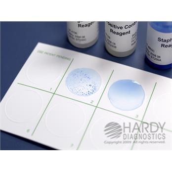 Disposable white cards with ten raised reaction circles used for rapid latex agglutination testing.