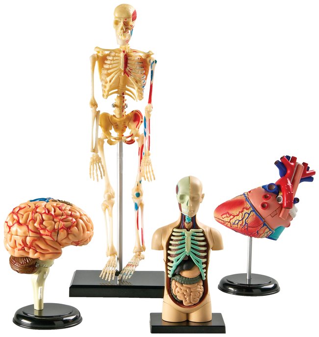 Ideal for human body centers focusing on major organs or the circulatory, nervous or skeletal systems. Each realistically detailed plastic model includes a display stand and guide with facts and step-by-step, photo-illustrated assembly instructions.Brain (S95867)Features cerebellum, frontal lobe, parietal lobe, temporal lobe, occipital lobe, corpus callosum, brain stem, hippocampus, ventricles, insula, corpus striatum, internal capsule and lentiform nucleus31-piece model measures 3.75 in.H (9.75cm) when assembledHeart (S95866)Features superior vena cava, inferior vena cava, right atrium, tricuspid valve, right ventricle, pulmonary valve, pulmonary artery, left atrium, mitral valve, left ventricle, aortic valve and aortaOpens when assembled so students can explore from the inside29-piece model measures 5 in.H (12.7cm) when assembledHuman Body (S95868)Features brain, skull, heart, rib cage, lungs, liver, stomach, pancreas, kidneys, small intestine, large intestine and spine31-piece torso model measures 4.5 in.H (11.4cm) when assembledSkeleton (S95869)Features skull, rib cage, humerus, spinal column, radius, ulna, hand, pelvis, femur, tibia, fibula, foot and partial circulatory system41-piece model measures 9.2 in.H (23.4cm) when assembledOrder InfoGrades 3 .