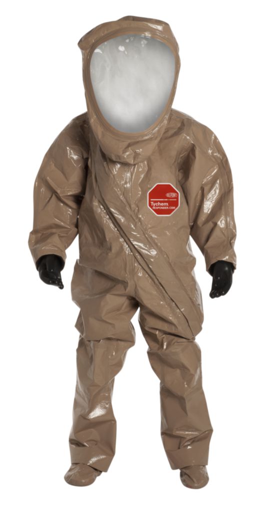 DuPont* Tychem* Responder* CSM Encapsulated Level A Suit^ Chemical and hazmat protection. Made to military specs. Features double taped seams, 2-layer faceshield, front zipper entry, triple storm flap, exhaust valves, expanded back, attached hood, sock boots, and butyl gloves. Tan. Large.