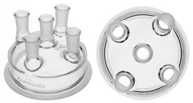 5-Neck Reaction Vessel Lid^ 100mm Schott* Flange, CN 24/40, 3-SN 24/40 Vertical, 1-SN 24/40 Angled 10 deg. Four side necks are vertical and one neck has a 10 deg degree angle. Lid has a flat ground surface allowing it to be greased or used with an o-ring