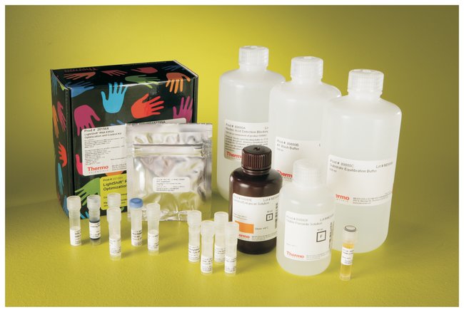 Thermo Scientific™ LightShift Chemiluminescent RNA EMSA Kit provides a non-radioactive solution for studying RNA-protein interactions using an electrophoretic mobility-shift assay (EMSA).The RNA EMSA Kit uses biotinylated RNA probes and a chemiluminescent substrate system to achieve fast and safe detection of RNA-protein complexes with sensitivity equivalent to traditional 32P-isotopic methods. The complete kit comes with all reagents required to set up and optimize protein-RNA binding conditions, a positive control for protein-RNA interactions and reagents for chemiluminescent detection of the nucleic acid interaction. Highlights:Sensitive – chemiluminescent detection comparable to radioactive detectionTime-saving – develop X-ray films after 1- to 5-minute exposures, versus 16 hour exposures needed with radioactive systemsFlexible – compatible with RNA probes biotinylated by different methodsEasy to use – complete kit includes optimized reagents for binding reactions and RNA probe detectionNon-radioactive – eliminate waste concerns from radioactive RNA probesThis product(s) resides on a Fisher Scientific GSA or VA contract. If you are viewing this page as a nonregistered user, the price(s) displayed is List Price. To view your GSA or VA contract pricing, log in using your account number, or become a registered user by contacting one of our Customer Service teams. You can also view your contract price by searching for this item(s) on GSA Advantage. To place an order, contact Fisher Scientific Customer Service.