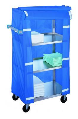 Linen Carts^ Compact and easily maneuverable. 16 1/4inw x 27 1/2inl x 46inh. easy to clean and sanitize. bumpers on legs and handles protect walls and furniture. includes nylon cart cover to protect contents from airborne dust and dirt while still allowing easy accessibility.