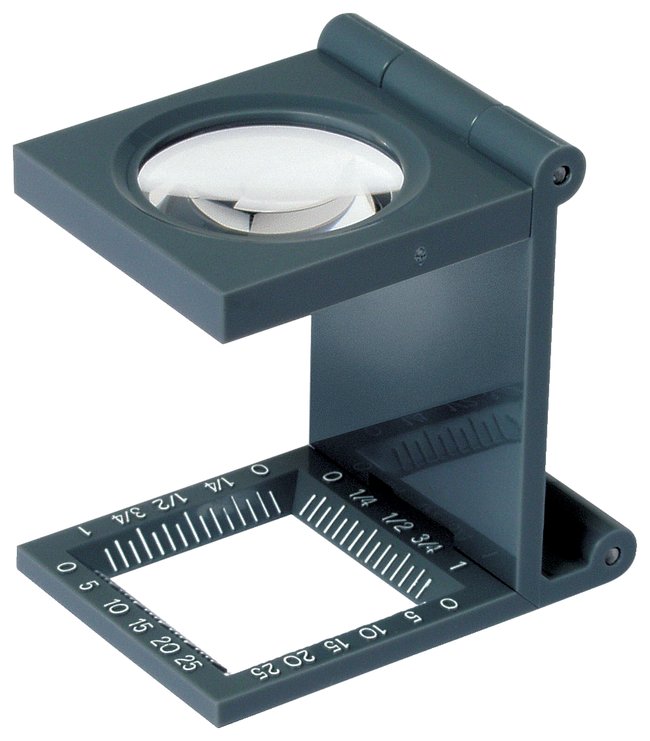 Compact loupe magnifiersMarkings in both inches and centimeters for easy measuringFold flat for storing when not in useSturdy metal frameComes with soft pouch