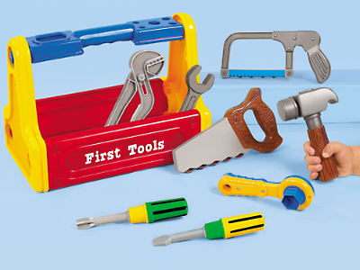 Young builders really get to work with this safe plastic tool set! It features 8 extra-chunky tools that are easy to hold and sized just for little hands—including a hammer, wrench, pliers, screwdrivers & a clicking handsaw. Set comes in an 11" tool tray for easy toting.