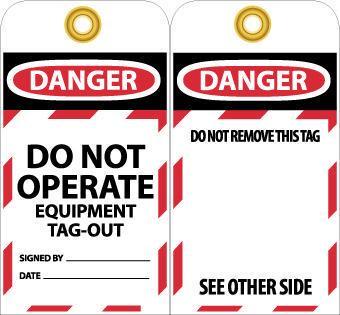 Lock Out Tag^ Made of .015 mil unrippable vinyl. 0.95cm brass grommets. Size: 15.2x8.3cm. Legend: DANGER and DO NOT OPERATE in red and white colors.