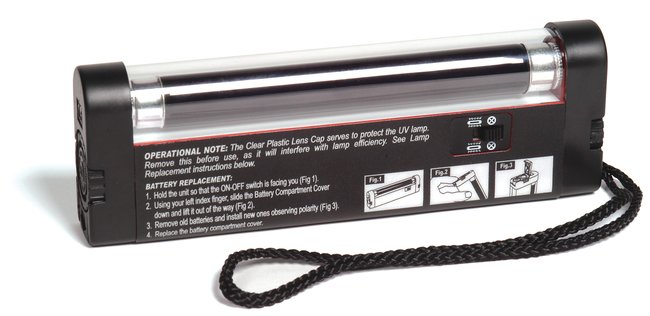 Ideal for theft detection in viewing invisible stains, powders and pastesFully portable, battery-operated longwave UV source housed in rugged ABS plasticPeak wavelength: 365nmOrder InfoDimensions: 6.25H x 2W x 0.75 in. D (15.9 x 5.1 x 1.9cm). Replacement bulb available separately.